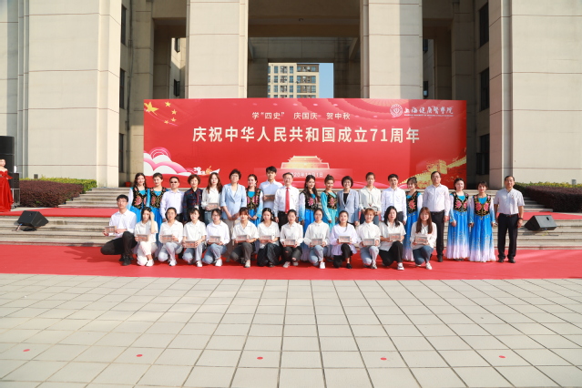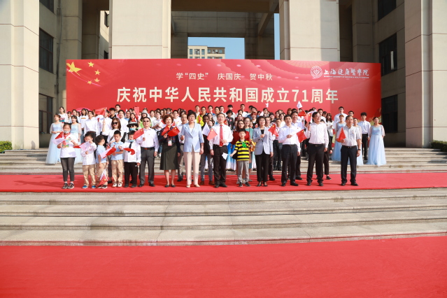10月1日,在中华人民共和国成立71周年之际,上海健康医学院四百余名师生齐聚南苑广场,隆重举行主题为“学‘四史’ 庆国庆 贺中秋”升旗仪式,以这一庄严神圣的方式向伟大祖国、伟大时代致敬献礼!全体校领导、中层干部代表和师生代表参加,党委宣传部解晓峰、学生党员工作站金依雯主持升旗仪式。