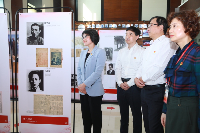 庆祝活动后,校领导和师生一同参观由学校与中共一大会址纪念馆共同举办的《星火相传——“四史”学习教育进校园主题展》。校党委书记郑锦、学生党员夏晨昀共同为主题展揭幕。